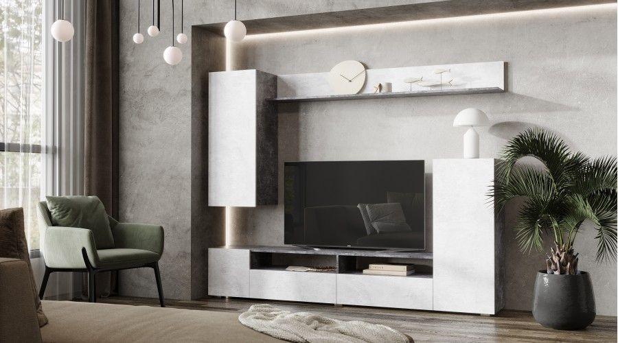 Габариты: 2130(Ш) х 350(Г) х 1700(В) мм Корпус (ЛДСП) цемент темный Фасад (ЛДСП) цемент светлый Кромка ПВХ Ниша под ТВ: 1330 мм