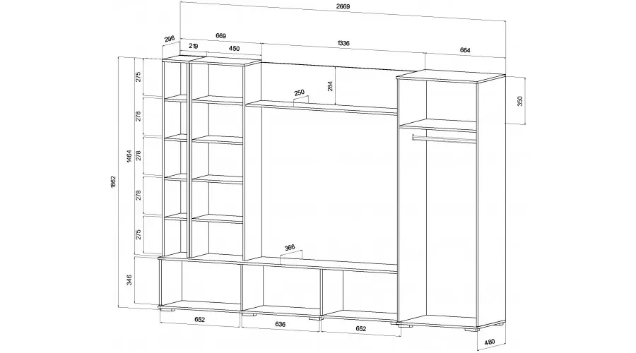 Гостиная Леванте Дуб Вотан/Кашемир Материал: ЛДСП. Кромка ПВХ. Универсальная сборка на любую сторону. Габариты: 2669 (ширина) х 480 (глубина) х 1862 (высота) мм. Опоры регулируемые по высоте черного цвета. Ручка прочный пластик черного цвета. Нижние створки на тумбе — распашные створки на петлях.