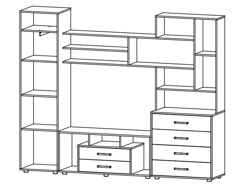 Гостиная Торонто анкор Габариты 2500(Ш) х 450(Г) х 2000(В) мм. Материал ЛДСП. Кромка ПВХ. На фасадах применено декоративное стекло с рисунком. Регулируемые по высоте опоры. На ящиках используются роликовые направляющие. Ниша ТВ: 1200(Ш) х 830(В) мм.