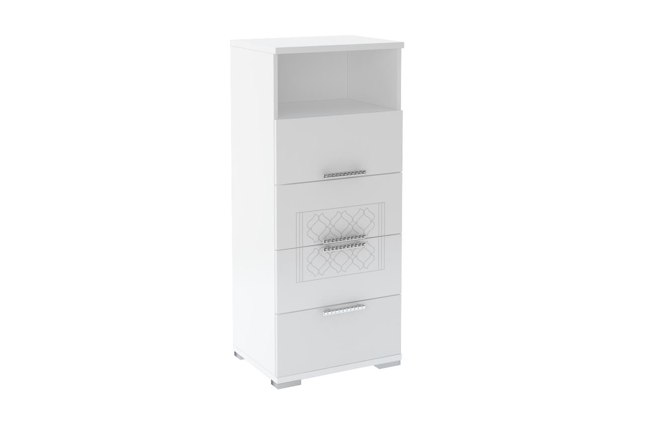 1. Комод имеет 4 выдвижных ящика на шариковых направляющих полного выдвижения. 2. Есть открытая секция для мелочей, которые нужны в быстром доступе. 3. Фасады МДФ с фрезеровкой «Орхидея» украшены ручками с кристаллами. 4. Крыша и дно комода изготовлены из ЛДСП 22 мм. 5. Прямоугольные опоры, высотой 20 мм. 6. Комод не перегружает пространство и, благодаря своим компактным габаритам, легко впишется в любое свободное пространство.